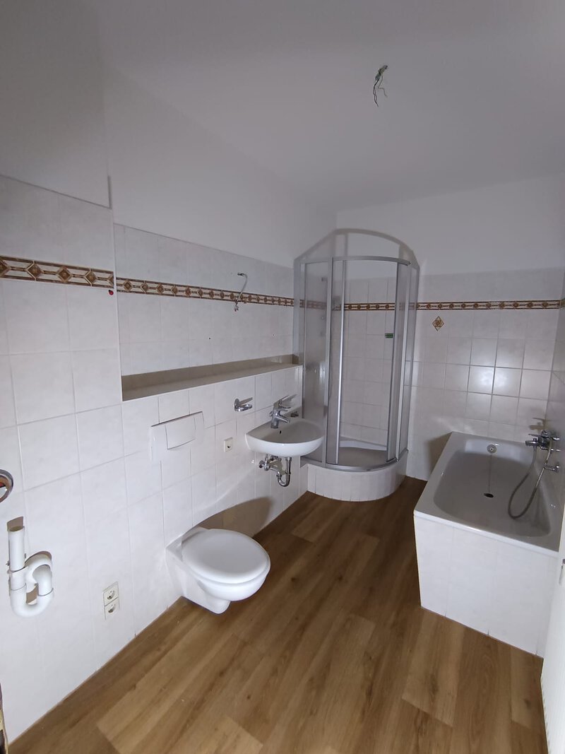 Die Wohneinheit verfügt über ein Wohnzimmer mit offenem Küchenbereich, einem Schlafzimmer, Flur und Bad. Das Bad ist ausgestattet mit Badewanne, Dusche, WC, Waschbecken, Wandfliesen.